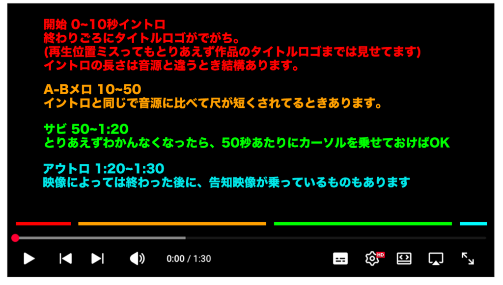 アニソン系だと、次の曲までの時間が短いので、曲で調べたときに、「誰かが作ったリリックビデオ」「静止画一枚動画」「字幕付き動画」というのを一瞬で見分けて、ハマる動画がないなら別の方向から探す、ということをやってたりします。